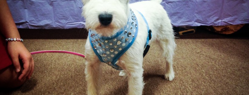 Our latest Bark Avenue Bling customer is a Fabulous Four Year Old Parson Russell Terrier. “Jewel” is an AKC Bronze Medalist! She has a great personality and a loving family. This is a pic of “Jewel” at the Crab Orchard Kennel Club AKC Dog Show in Marion, Illinois. Her owner chose the Blooming Blue Polka Dot Harness. The light blue harness is covered in clear crystals which makes her white coat Pop! You can buy this same look on our Etsy page.
