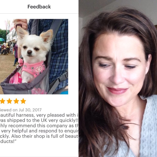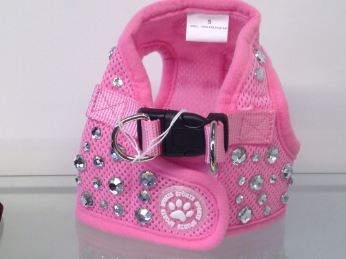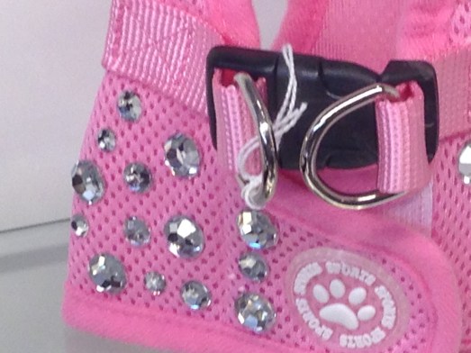www.barkavenuebling.etsy.com/We’re thrilled to hear from Bethan in Hampton Court, England. She ordered the pink bling harness for her pup on Etsy and was kind enough to share a pic.