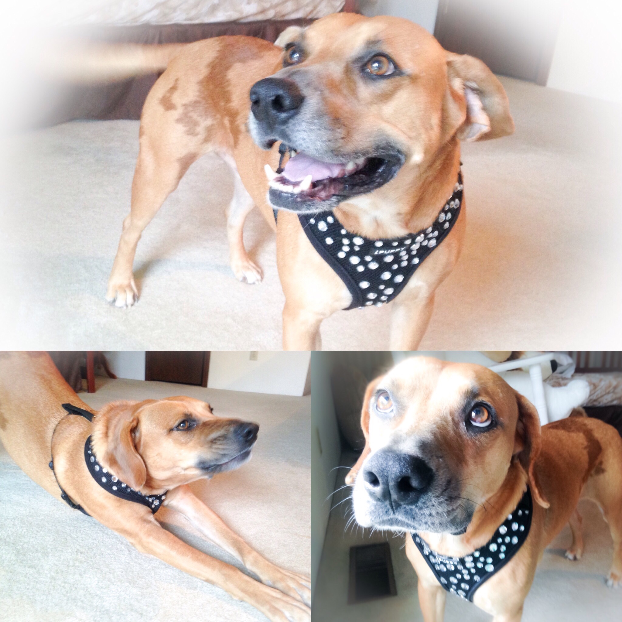 Big dogs deserve a stunning entrance too. “Red” is beaming as he struts and stretches in this black & crystal show stopper!